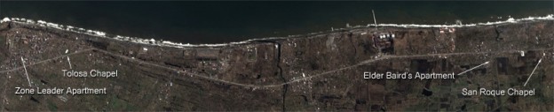 When the Zone Leaders had visited the day before, they had told us that their apartment had been destroyed, but that we were welcome to come to the Tolosa chapel, which many of the members were still using as a shelter since their homes had been destroyed by the wind. We supposed that the Tolosa Chapel might be better supplied than any other place that we could seek shelter that was nearby, especially since it functions as the District Center for the Tolosa District, which presides over many of the congregations on the eastern shore of Leyte. We figured that the leadership there would be more in control of the situation, and that any relief effort coming top-down through the church would probably arrive there first, not only because of its District Center function, but also because it was the closest chapel in the District to Tacloban City, which we still assumed to be less-affected than where we were.